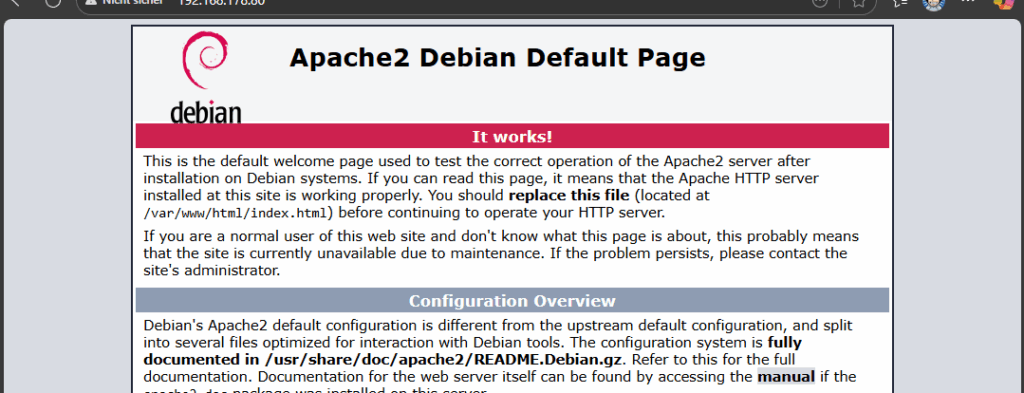Um zu prüfen, ob die Installation korrekt abgeschlossen ist, sollte bei Aufruf der IP-Adresse des Raspberry Pi mit einem Browser die Apache2 Webseite erscheinen – und ja, dort wird Debian als OS genannt. Das liegt allerdings daran, dass Raspberry OS auf Debian basiert und deshalb als solches erkannt wird.