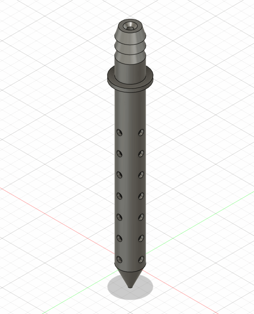 Die gedruckte Wasserdüse habe ich mit unseren Pumpe auf Funktion getestet. Leider kommt zu viel Wasser aus der Düse, weswegen ich eine Verjüngung hinzugefügt habe, sodass die Wassermenge begrenzt wird.