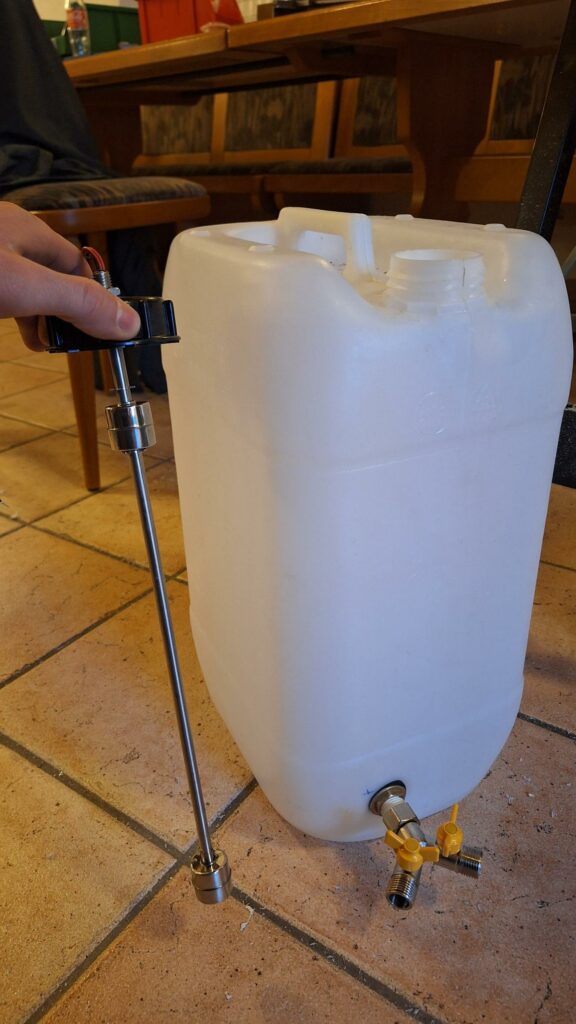 Für die Wasserversorgung haben wir uns für einen 25 Liter Wasserkanister entschieden. In den Kanister haben wir dann eine Verschraubung eingebaut um einen Schlauch anzuschließen an dem unsere Pumpen hängen. Außerdem haben wir einen Füllstandsensor eingebaut um den Minimalwert bestimmen zu können.