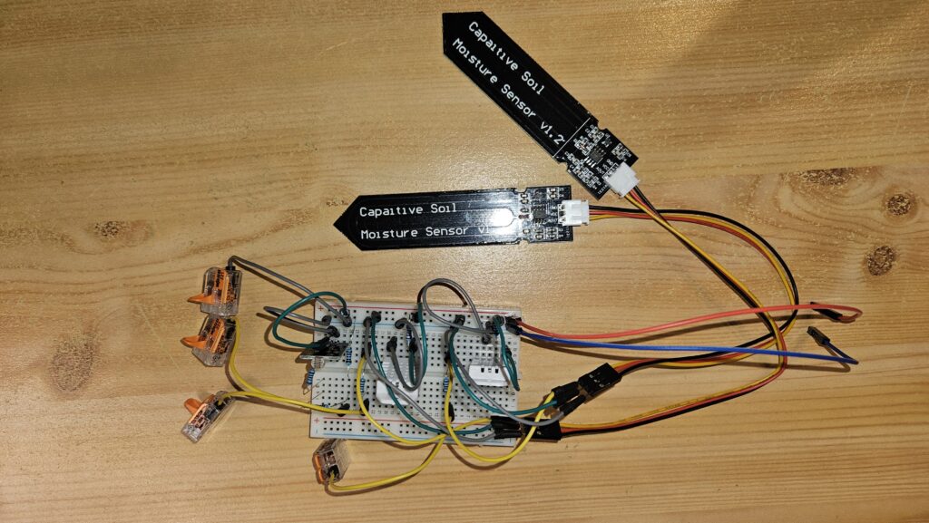 Aber auch hier gilt: Nicht direkt an die Eingänge des Controllers / MCP2221 anschließen! Erst wird mit einem Multimeter mal nachgemessen, was wirklich an Spannung für das analoge Signal rauskommt! Bei den Bodenfeuchtigkeitssensoren habe ich das ja bereits mal vorab getestet. Entsprechend weiß ich an dieser Stelle, wo sich die Spannung bewegt – das ist ja auch entsprechend schon in dem Testprogramm eingebaut gewesen. Wichtig ist hier noch, dass alle Pins des MCP2221 von mir nur mit vorgeschaltetem 1k Ohm Widerstand betrieben werden, damit zumindest bei kurzzeitigem Kurzschluss kein Schaden entsteht. Die Bodenfeuchtigkeitssensoren bewegen sich zwischen 2,2V im trockenen Zustand und 1,1V im nassen Zustand (ungefähr – so genau sind die leider nicht, sodass mit einer gewissen Toleranz gerechnet werden muss). Wichtig für den heutigen Tag war allerdings der LDR Sensor – unser Lichtsensor. Dessen Widerstand steigt, wenn ihm ein Licht aufgeht. Folglich sinkt die Spannung. Ist es dagegen jedoch dunkel, sinkt der Widerstand und die Spannung steigt – im ersten Versucht auf bis zu 4,3V. Das ist prinzipiell erstmal gut, da hiermit klar ist, dass der LDR funktioniert. Problematisch ist allerdings, dass er so viel Spannung ausgibt – und das potentiell jede Nacht. Da die Pins des MCP2221 aber mit maximal 3,3V beschaltet werden können, liegt hier ein kleines Problem vor. Das funktioniert so nämlich nicht… also zumindest nicht, ohne den MCP2221 zu beschädigen. Und jetzt kommt ein Punkt zum Tragen, der vermutlich das Herz eines nahezu jeden Berufsschullehrers im Bereich Elektrotechnik höher schlagen lässt.