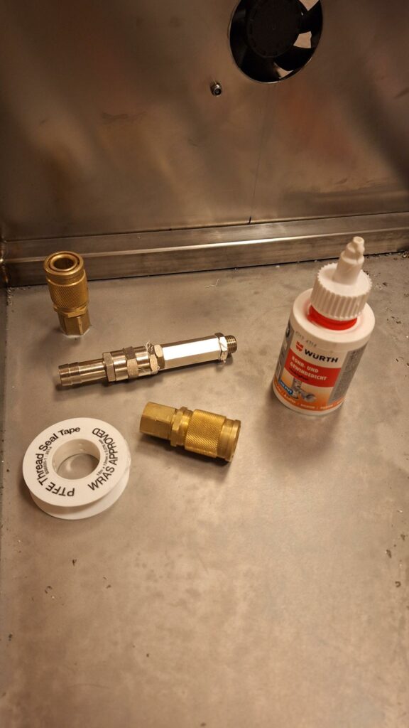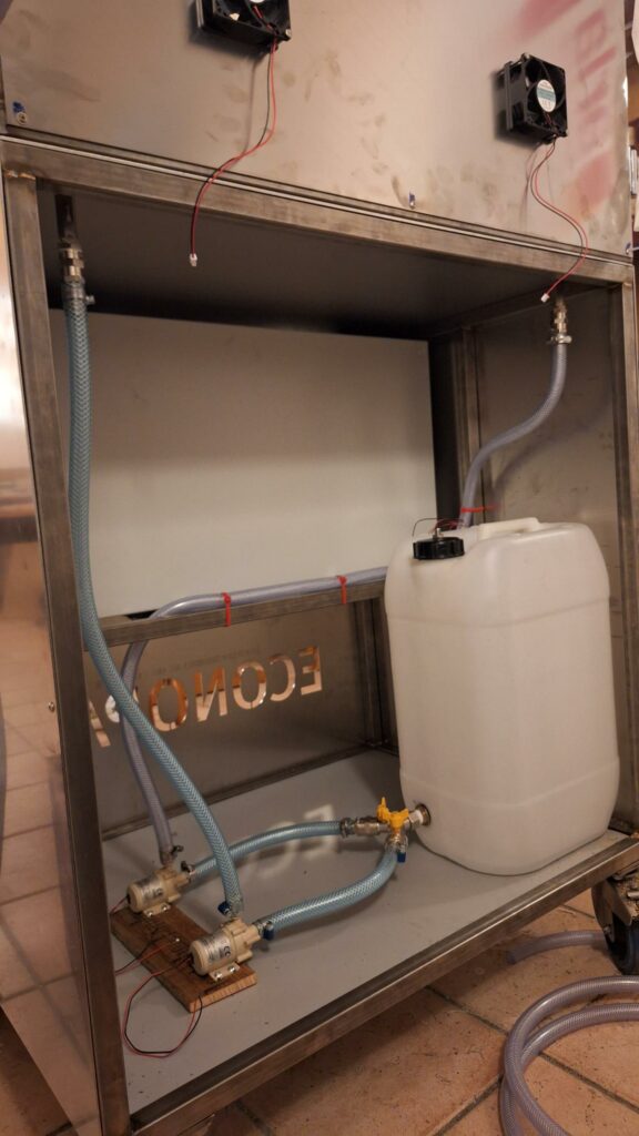 Um die mechanischen Arbeiten abzuschließen haben wir heute die Wasserschläuche verlegt. Vorher haben wir die Kupplungen an der Kammer mit Rückschlagventilen ergänzt um ein leer laufen der Schläuche zu verhindern. Im nächsten Schritt haben wir dann die Pumpen auf der Bodenplatte befestigt. Im Anschluss haben wir alles mit Schläuchen verbunden.