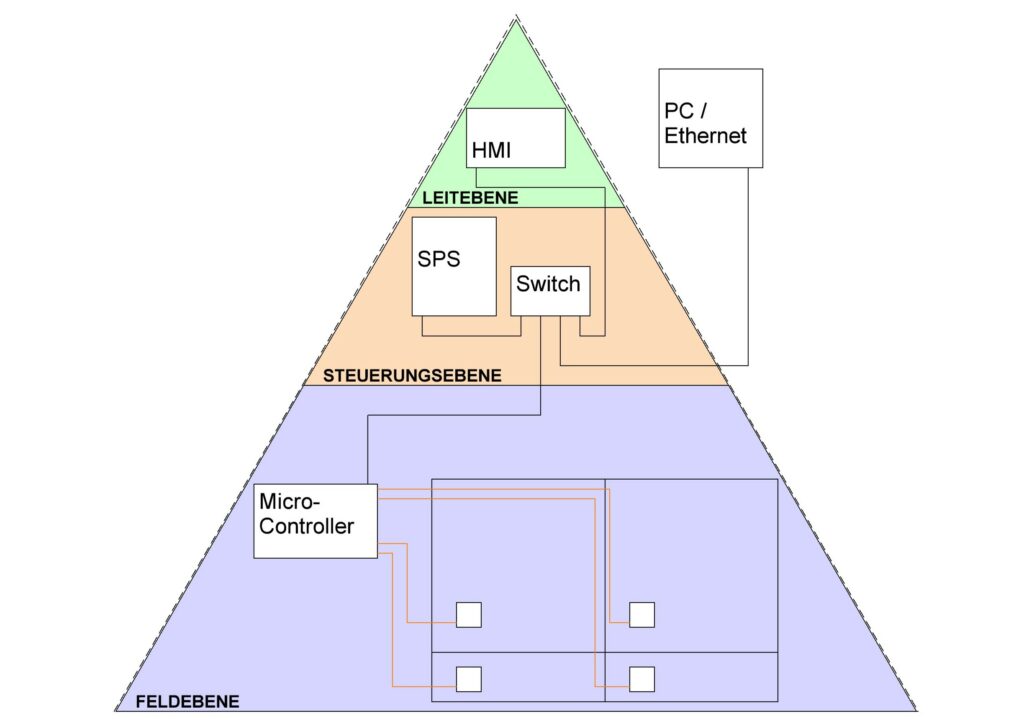 Unterhalb in einem Fach finden sich dann die Pumpen, die jedes Kompartiment einzeln mit Wasser versorgen. Zusätzlich ist hier das Herzstück der automatisierten Einrichtung zu finden – der Micro-Controller. Auf Wunsch der Bildungsanstalt werden zusätzlich noch eine SPS (Speicherprogrammierbare Steuerung) und ein HMI (Human-Machine-Interface) verwendet. Damit ergibt sich die Konstellation, dass der Micro-Controller die Sensoren abfragt und als Feldebene die Daten an die SPS weitergibt. Die SPS bildet hier die Automationsebene, die empfangene Daten bewertet und entsprechende Maßnahmen einleitet, so z.B. das Einschalten der Pumpe. Über das HMI kann der Nutzer diverse Einstellungen bezüglich der Pflanzenpflege selbst treffen, wobei in Gänze jedoch der Fokus darauf liegt, dass hier nur ausgewählt wird, welche Pflanze bewirtschaftet werden soll und die Logik im Hintergrund alle weiteren Schritte übernimmt. Allerdings kann sich der Nutzer hier jederzeit über Parameter wie Lufttemperatur oder Bodenfeuchtigkeit informieren und nach eigenem Ermessen zusätzlich manuell übersteuern.
